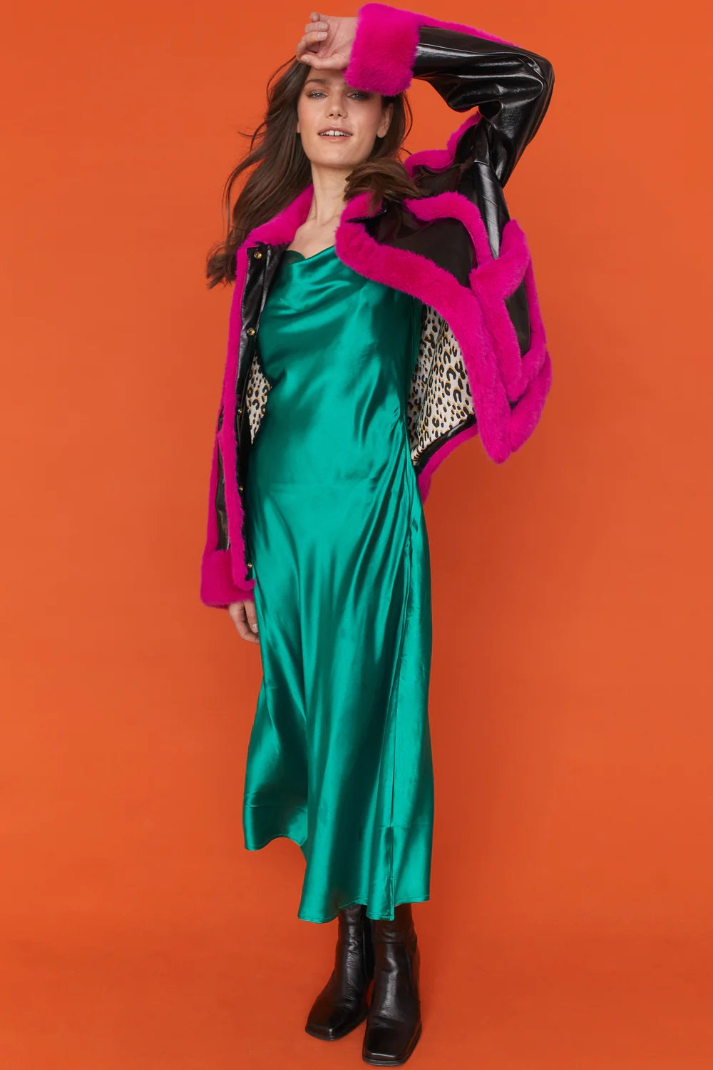 Black Pink Faux Leather with Faux Fur Trim Aviator Jacket