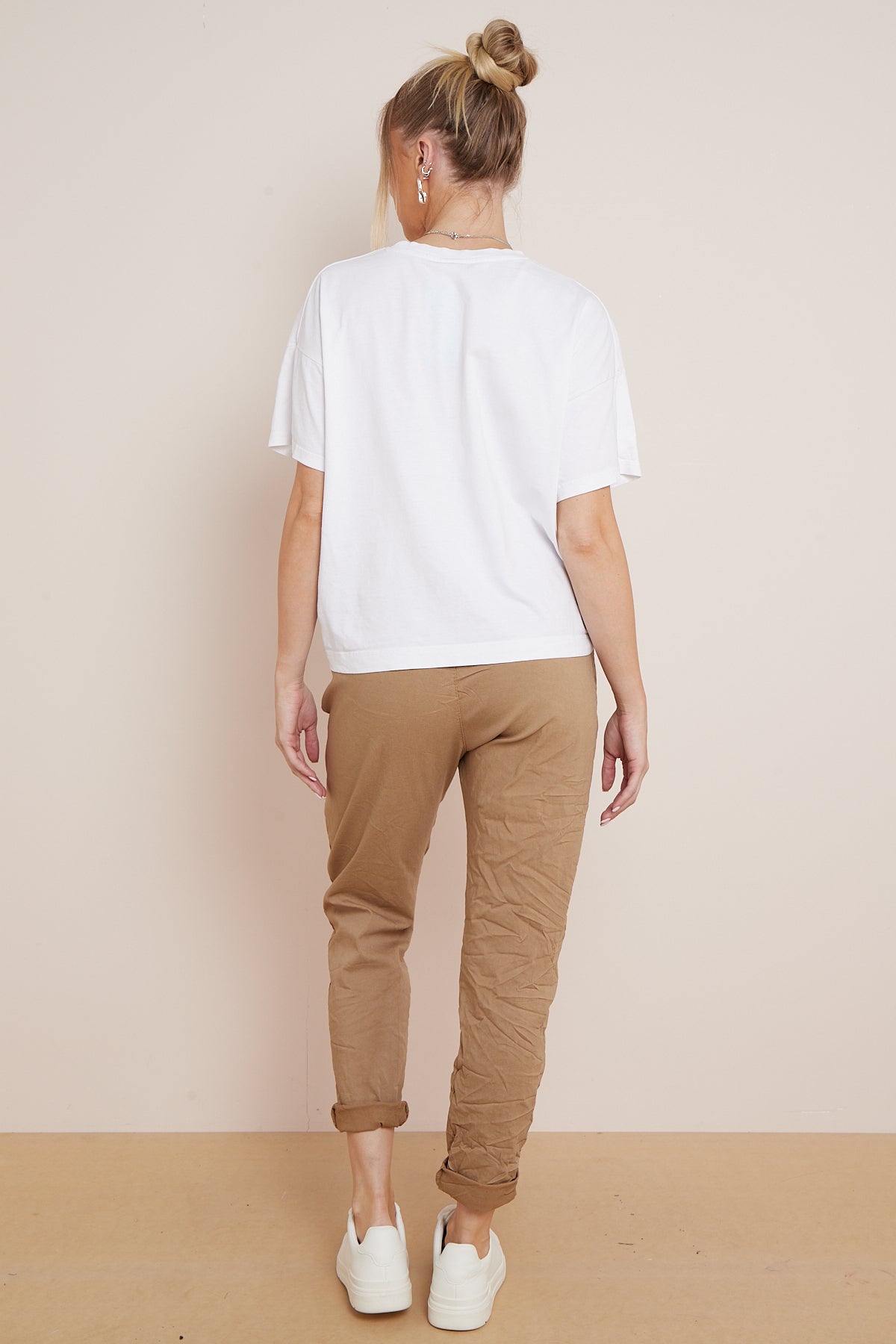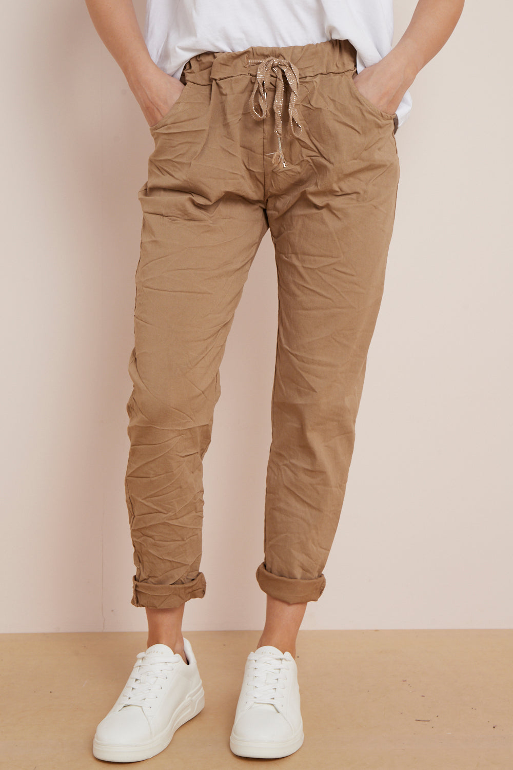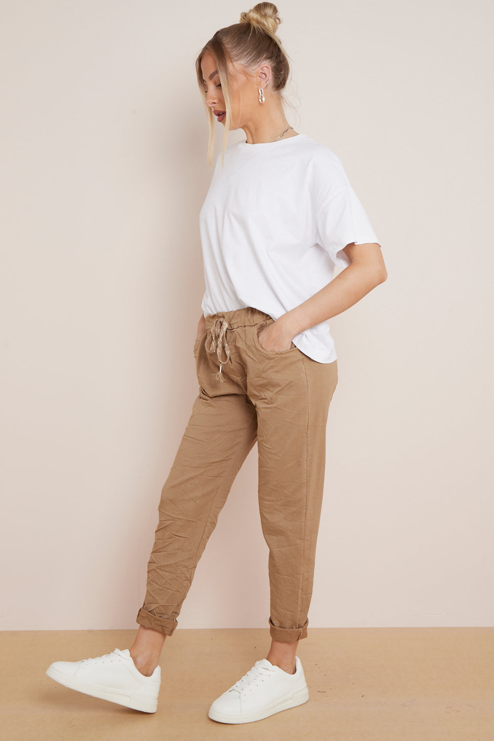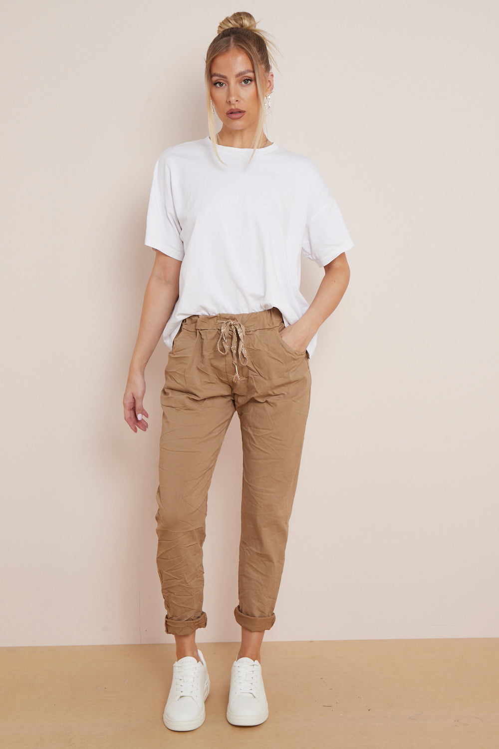 Crafted from a stretchy and lightweight viscose blend, these comfortable Aftershock London trousers in Camel are designed in a tapered cut with casual rolled-up hems and a mid-rise drawstring waist. Side pockets complete the design.