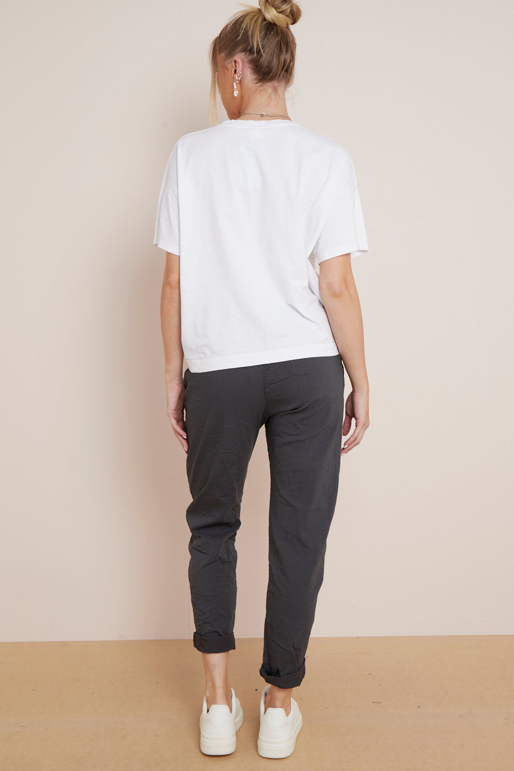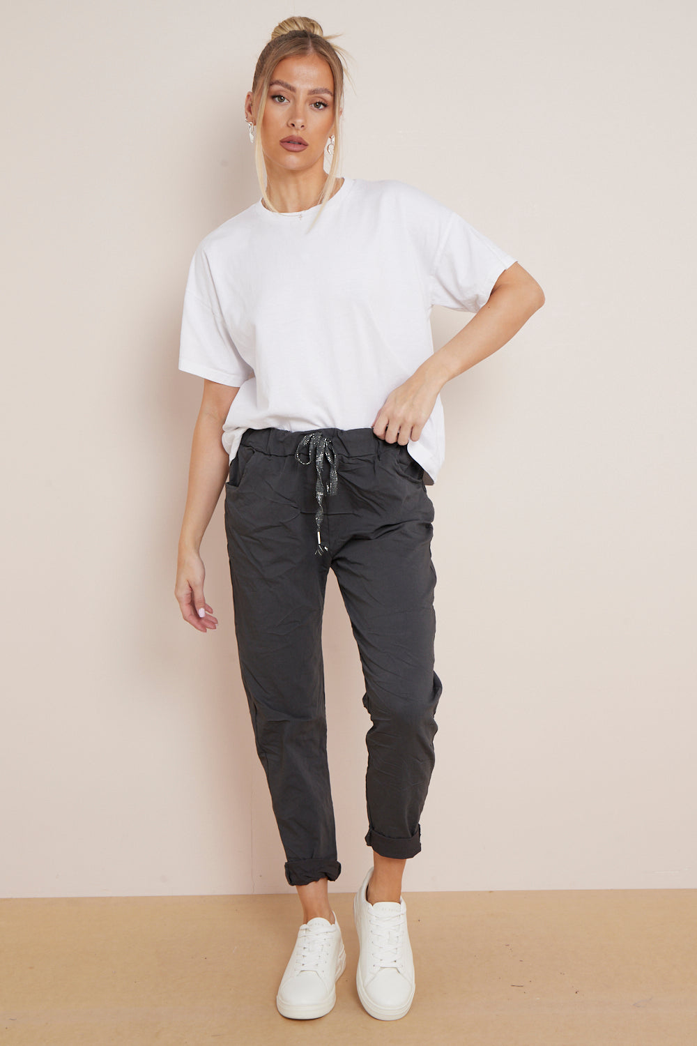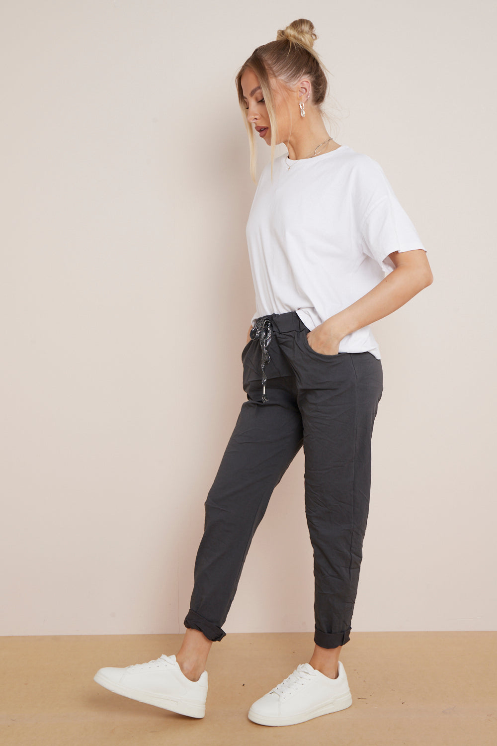 Crafted from a stretchy and lightweight viscose blend, these comfortable Aftershock London trousers in Charcoal are designed in a tapered cut with casual rolled-up hems and a mid-rise drawstring waist. Side pockets complete the design.