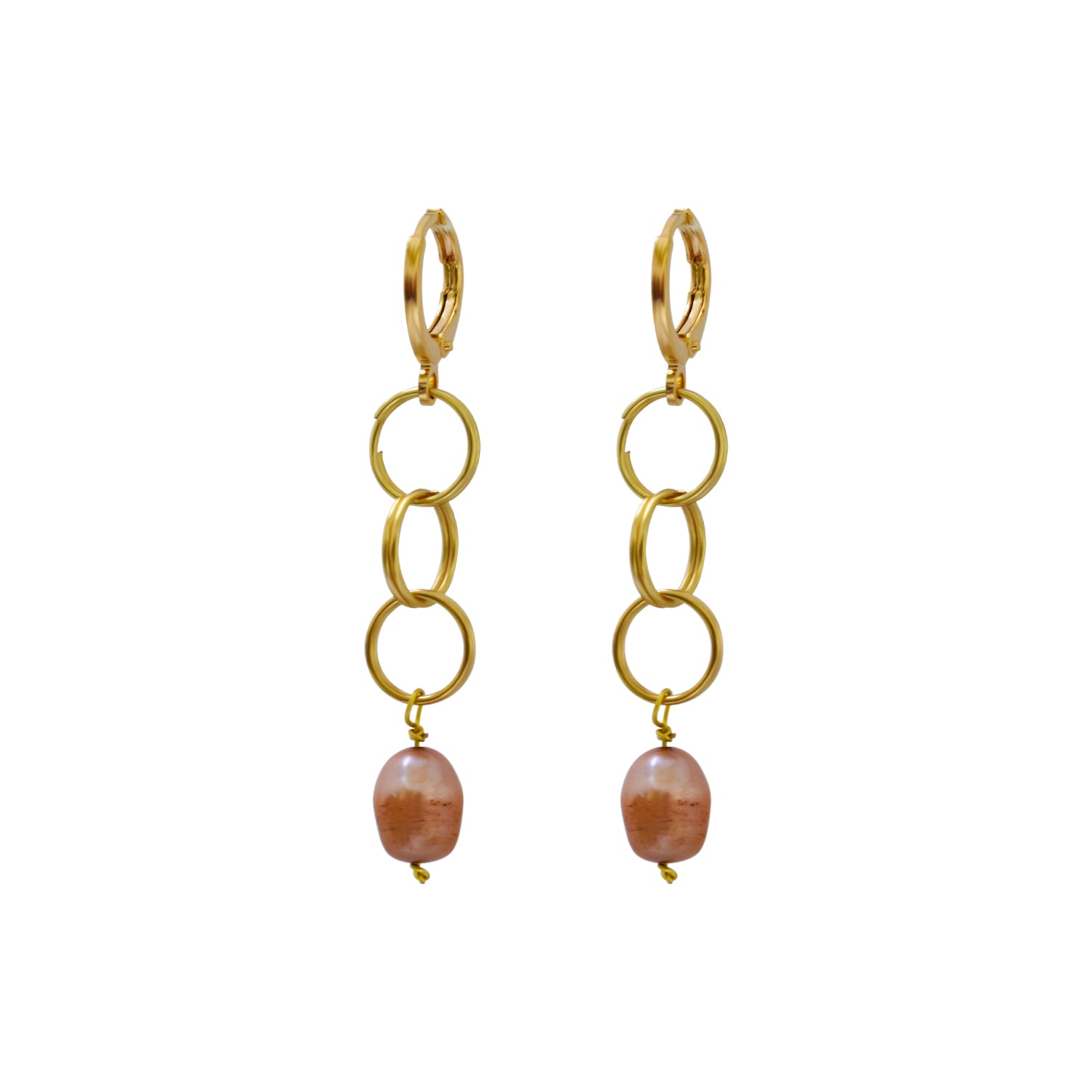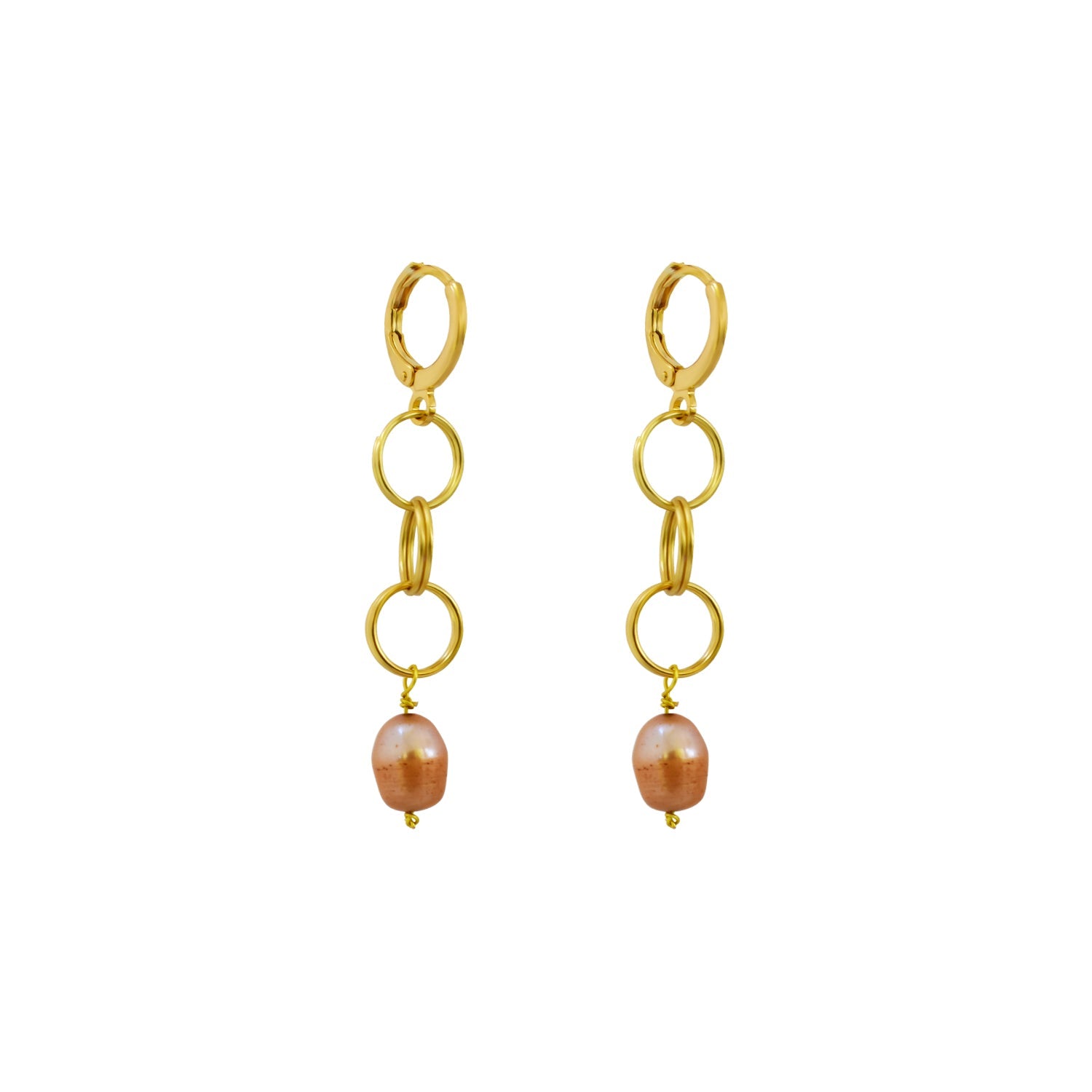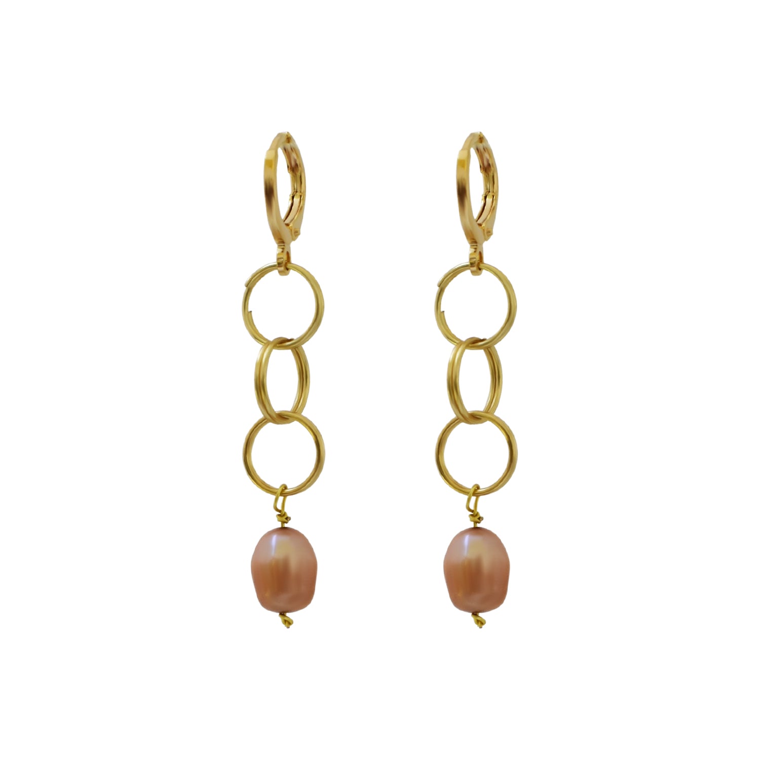 Choose this tastefully pearl and gold pair of earrings. Handcrafted with gold plated brass and a naturally pink freshwater pearl.