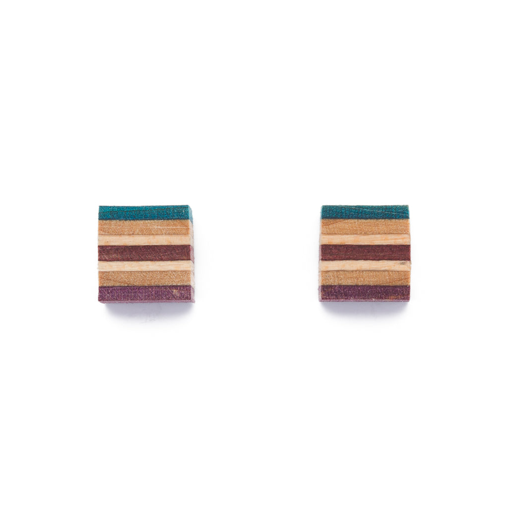 Our Square Recycled Skateboard Stud Earrings are handcrafted by a skater who is also passionate about upcycling. He saw that many old and broken boards get discarded and decided to salvage them. He uses his craftsmanship to turned the wasted skateboard decks into beautiful earrings and other pieces of jewellery. The skateboard decks are used in their original state and apart from being cut, sanded and finished, waste is kept to a minimum.