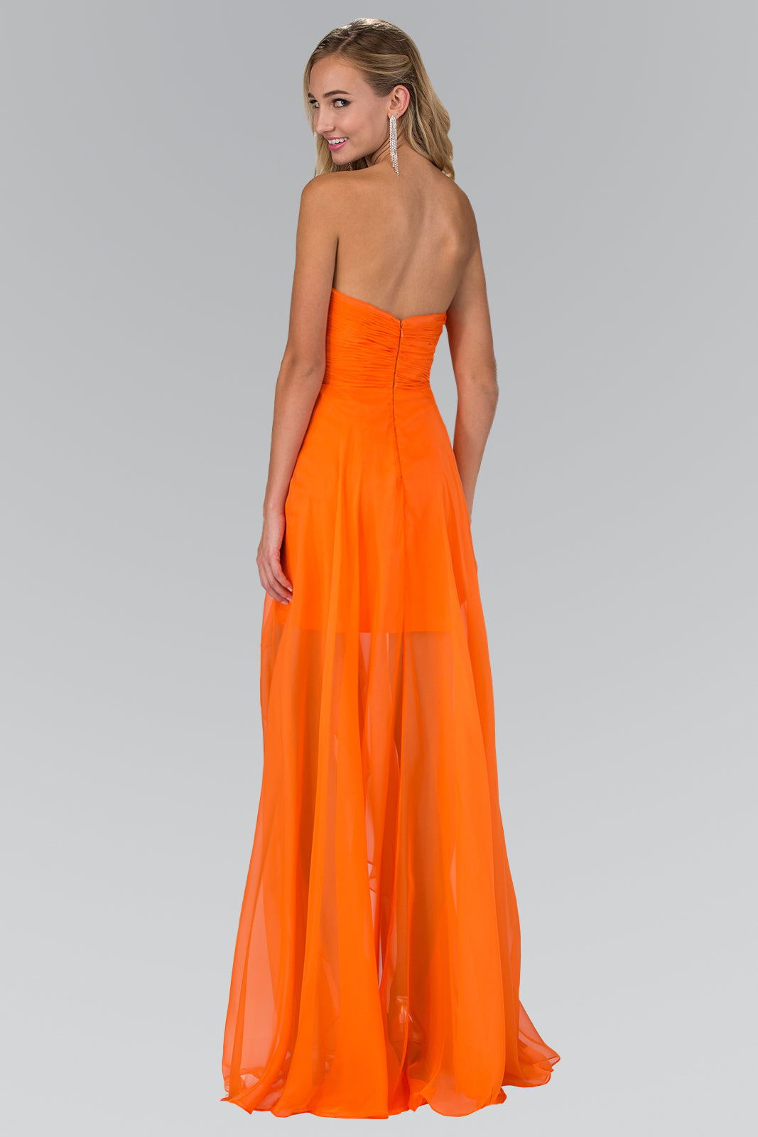 Dress with Ruched Bust and Over Skirt Strapless dress with sweetheart neckline, has a high-low silhouette and ruched bust. The dress is made of chiffon and decorated with jewels and beads. Available in Orange