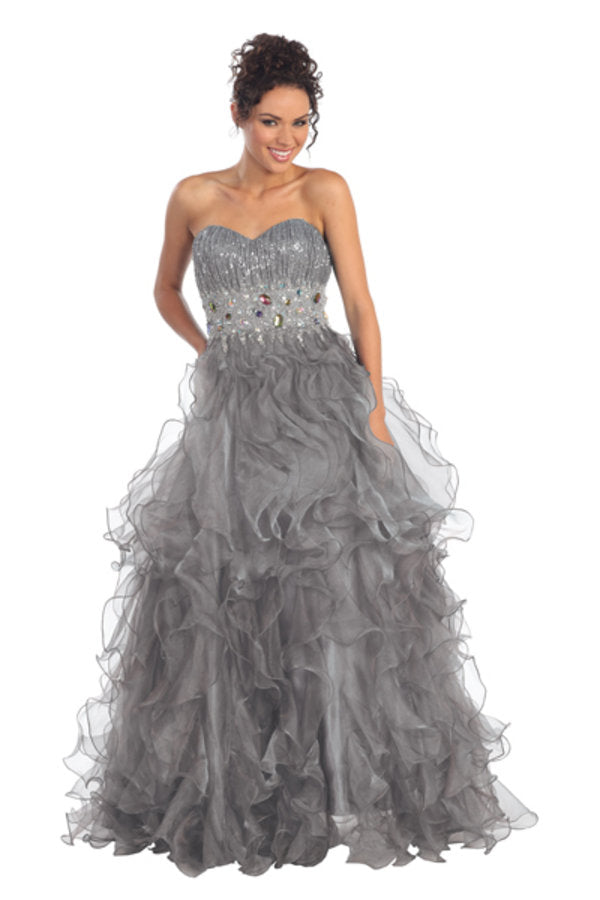 Indulge in luxury and sophistication with our Strapless Sweetheart Organza Long Ruffle Dress. Adorned with sparkling jewels and intricate beadwork, this A-Line dress features a sweetheart neckline and a back zipper for a flawless fit. The sea green organza adds a touch of elegance, while the back open design adds a daring edge. Perfect for any prom or special occasion. Available in a stunning silver shade.