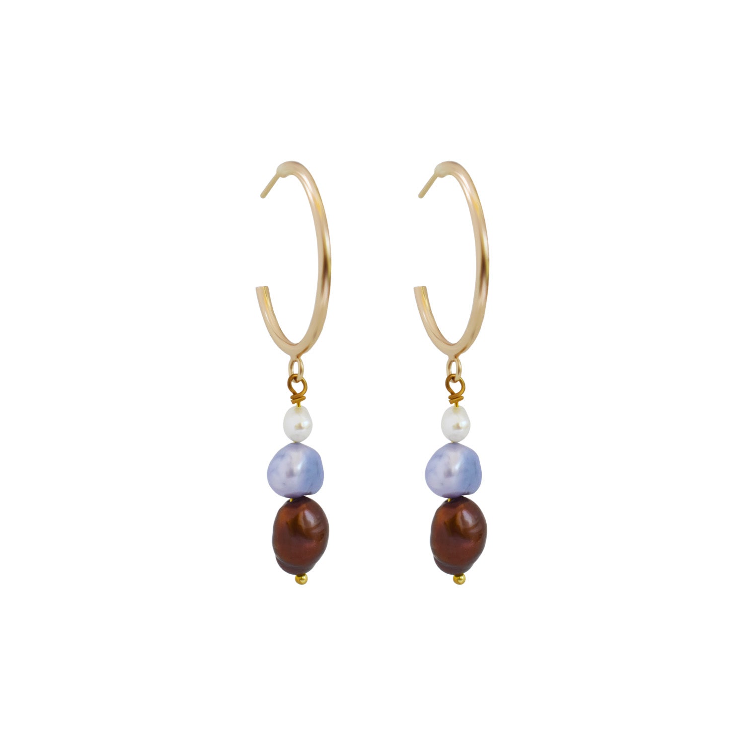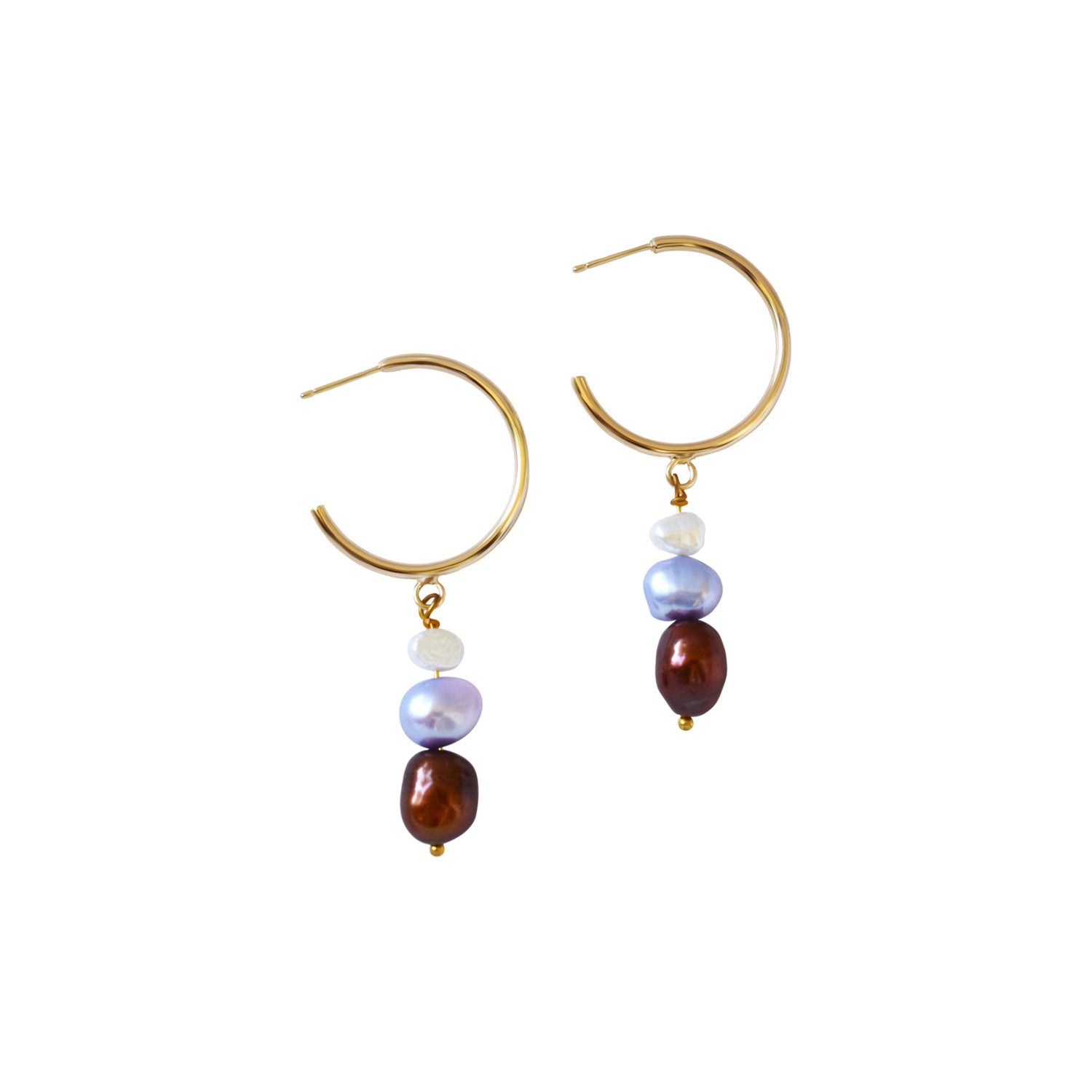 White, purple, and bronze freshwater pearl gold-plated brass hoop earrings | by Ifemi Jewels